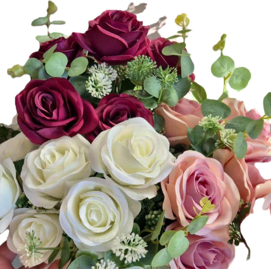 45 cm magas selyem rózsa csokor, teljesen élethű megjelenéssel. Bordó színű