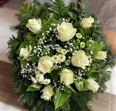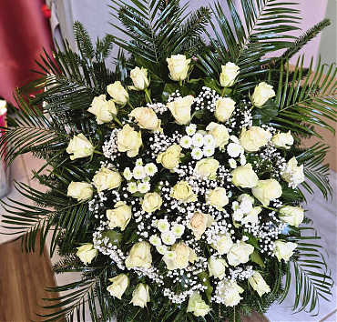 Kötött technikával készült, vizes oázis alapon lévő közép réteggel, díszítő levelekkel készült koszorú. 40 szál fehér élő rózsával.