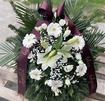 Álló koszorú készítés hagyományos és tűzött technikával. Templomi temetésre, szórásos temetésre korporsós és urnás temetésre kiszállítással minőségi, igényes kivéltelben.